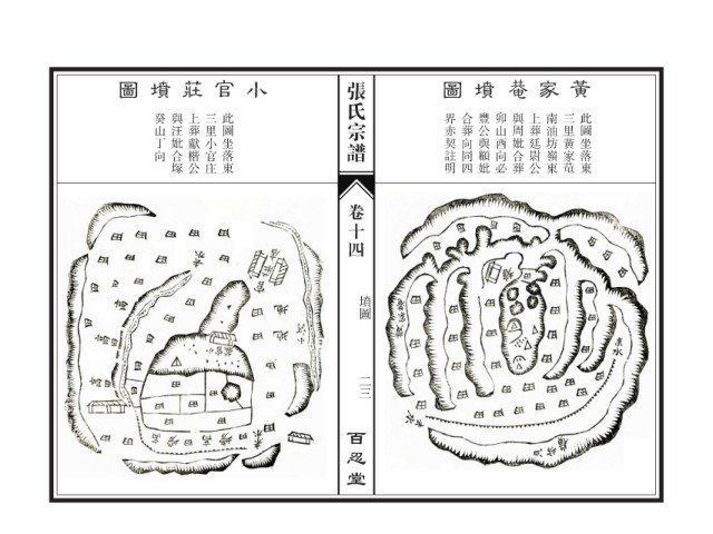 圖 墳 莊 官 小 张氏宗谱 圖 墳 家 黃 癸山丁向 與汪妣合塚 上葬獻楷公 三里小官庄 此圖坐落東 界赤契註明 合葬向同四 豐公與顧妣 卯山酉向必 與周妣合葬 上葬廷尉公 南油坊嶺東 三里黃家 此圖坐落東 卷十四 墳圖 二三 百忍堂