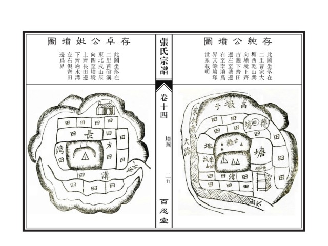 圖 墳 妣 公 卓 存 张氏宗谱 圖 墳 公 純 存 邊爲界 左右俱齊田 下齊過水溝 上齊長田邊 向四至墳境 東北戌山辰 二里首 此圖坐落在 世系載明 界其餘墳塚 右至李墳爲 邊左至塘邊 古灘下齊田 向墳境上齊 塘西乾山巽 二里曹家大 此圖坐落在 溝 卷十四 墳圖 二五 百忍堂