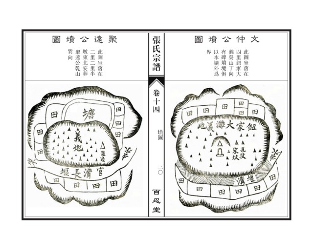 圖 墳 公 遠 聚 张氏宗谱 圖 墳 公 仲 文 巽向 聚遠公乾山 墩東北安葬 二里二里半 此圖坐落在 界 以本壙外爲 有碑墳境俱 灘癸山丁向 四里鈕家大 此圖坐落在 卷十四 墳圖 三〇 百忍堂