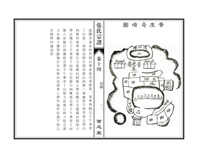 张氏宗谱 圖 墳 度 普 右俱齊田邊爲界 又本灘下灘葬獻琬公艮山坤向其墳界上齊旱地外田邊下與左 第八必翰公與龔妣合葬子午兼癸丁向第九必琢公與王妣合葬 葬必馥公子午兼癸丁向第七廷衞公與陳妣合葬子午兼癸丁向 同第四塚葬必馨公之夏妣向同第五葬必馥公之盛妣向同第六 丁向第二塚葬廷楨公與章妣向同第三塚獻 此圖坐落在四里繞山塘普度 卷十四 基南第一塚葬齊隆公子午兼癸 墳圖 公與李妣合葬向 三一 百忍堂
