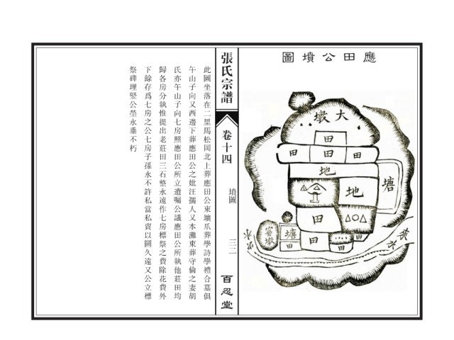 张氏宗谱 圖 墳 公 田 應 祭碑埋竪公塋永垂不朽 下餘存爲七房之公七房子孫永不許私當私賣以圖久遠又公立標 歸各房分執惟提出老莊田三石整永遠作七房標祭之費除花費外 氏亦午山子向七房照應田公所立遺囑公議應田公所執他莊田均 午山子向又西邊下葬應田公之妣汪孺人又本灘東葬守倫之妻胡 此圖坐落在二里馬松岡北上葬應田公東壙爪葬學詩學禮合墓俱 卷十四 墳圖 三二 百忍堂