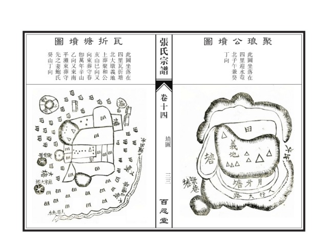 圖 墳 塘 折 瓦 张氏宗谱 圖 墳 公 琅 聚 癸山丁向 先之妻鮑氏 平灘東葬守 乙向又東南 卽萬年辛山 向東葬守春 亥山巳向又 上葬聚和公 北大墩義地 四里瓦折塘 此圖坐落在 丁向 北子午兼癸 四里迎水 此圖坐落在 卷十四 墳圖 三三 百忍堂