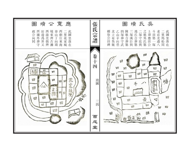 圖 墳 公 寬 應 张氏宗谱 圖 墳 氏 吳 政公向同 西壙外葬守 田邊爲界又 西南北俱齊 境東齊古灘 癸山丁向墳 西佃庄東南 二里花家城 此圖坐落在 標祭公田碑 北立有吳妣 乙山辛向塋 四塚葬守武 陳妣合葬第 三塚漢臣與 馮氏合葬第 二塚守廷與 之妣吳氏第 上葬應田公 斗田第一塚 老莊北邊八 二里馬松岡 此圖坐落在 卷十四 墳圖 三四 百忍堂