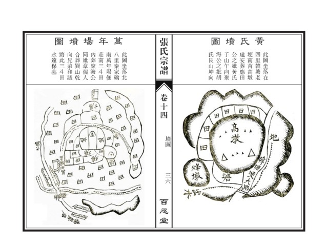 圖 墳 場 年 萬 张氏宗谱 圖 墳 氏 黃 永遠保墓 將此三斗田 向兄弟和議 合葬巽山乾 同妣章孺人 內葬聚海公 莊南三斗田 南萬年場佃 八里秦家礄 此圖坐落北 氏艮山坤向 海公之妣胡 子山午向聚 公之妣黃氏 處安葬應田 埂南首高墩 四里韓塘老 此圖坐落在 卷十四 墳圖 三六 百忍堂