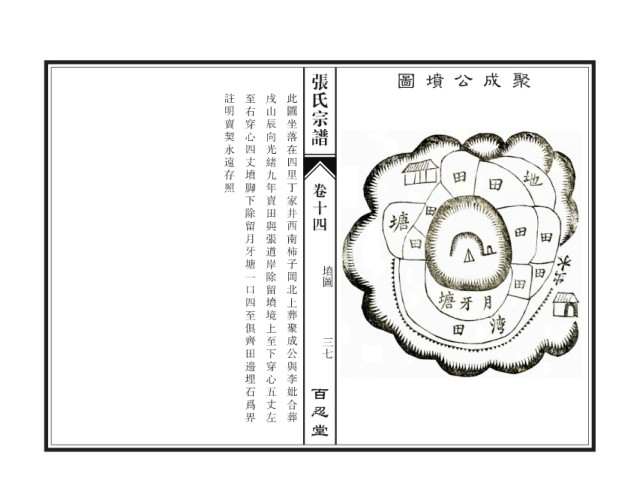 张氏宗谱 圖 墳 公 成 聚 註明賣契永遠存照 至右穿心四丈墳脚下除留月牙塘一口四至俱齊田邊埋石爲界 戌山辰向光緒九年賣田與張道岸除留墳境上至下穿心五丈左 此圖坐落在四里丁家井西南柿子岡北上葬聚成公與李妣合葬 卷十四 墳圖 三七 百忍堂
