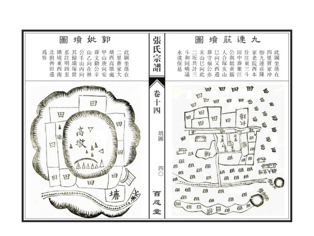 圖 墳 妣 郭 张氏宗谱 圖 墳 莊 連 九 爲界 北俱齊田邊 墳境東西南 系註明四至 其餘墳塚世 公壬山丙向 山乙向在林 葬文勤公辛 甲山庚向安 塘西高墩處 二里曹家大 此圖坐落在 永遠保墓 斗和同嘀議 二坵共計三 亥山巳向此 葬守福公亦 巳向又西邊 人合塚亥山 公與妣黃孺 田中葬聚江 住庄東三斗 家老院西本 卽九連莊陳 四里賈家冲 此圖坐落在 卷十四 墳圖 四〇 百忍堂