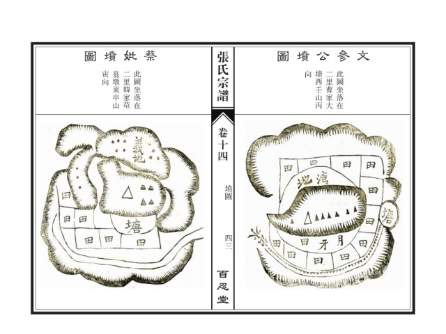 圖 墳 妣 蔡 张氏宗谱 圖 墳 公 參 文 寅向 墓墩東申山 二里韓家 此圖坐落在 向 塘西壬山丙 二里曹家大 此圖坐落在 卷十四 墳圖 四三 百忍堂