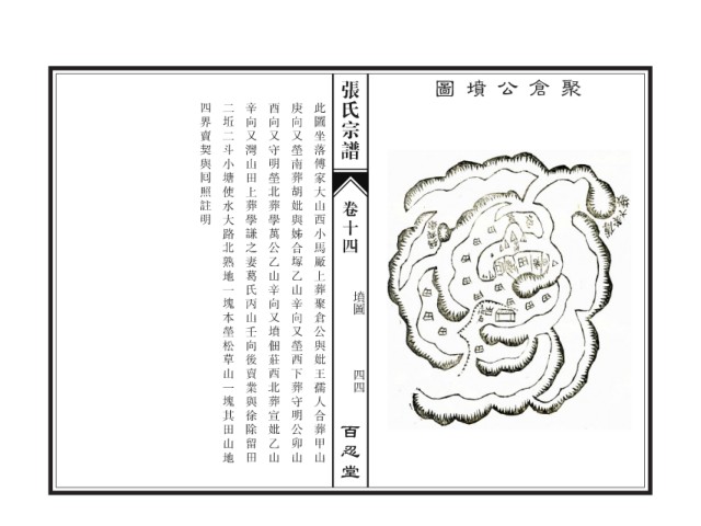 张氏宗谱 圖 墳 公 倉 聚 四界賣契與囘照註明 二坵二斗小塘使水大路北熟地一塊本塋松草山一塊其田山地 辛向又灣山田上葬學謙之妻葛氏丙山壬向後賣業與徐除留田 酉向又守明塋北葬學萬公乙山辛向又墳佃莊西北葬宣妣乙山 庚向又塋南葬胡妣與姊合塚乙山辛向又塋西下葬守明公卯山 此圖坐落傅家大山西小馬厰上葬聚倉公與妣王孺人合葬甲山 卷十四 墳圖 四四 百忍堂