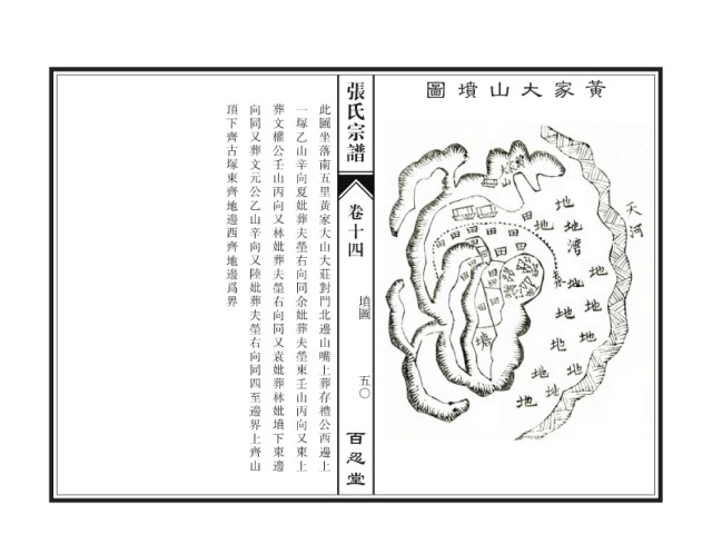 张氏宗谱 圖 墳 山 大 家 黃 頂下齊古塚東齊地邊西齊地邊爲界 向同又葬文元公乙山辛向又陸妣葬夫塋右向同四至邊界上齊山 葬文權公壬山丙向又林妣葬夫塋右向同又袁妣葬林妣墳下東邊 一塚乙山辛向夏妣葬夫塋右向同余妣葬夫塋東壬山丙向又東上 此圖坐落南五里黃家大山大莊對門北邊山嘴上葬存禮公西邊上 卷十四 墳圖 五〇 百忍堂