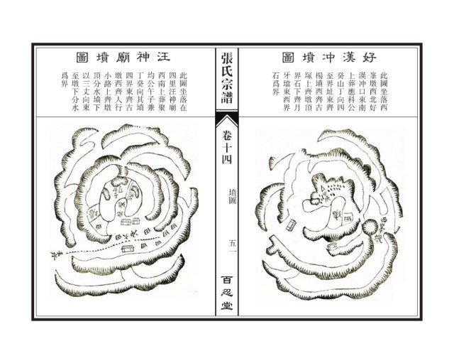 圖 墳 廟 神 汪 张氏宗谱 圖 墳 冲 漢 好 爲界 至墩下分水 以三丈向東 頂分水墳下 小路上齊墩 墩西齊人行 四界東齊古 丁癸向其墳 均公午子兼 西南上葬聚 四里汪神廟 此圖坐落在 石爲界 牙壋東西界 界石下齊月 塚上齊墩頂 楊墳西齊古 至界址東齊 癸山丁向四 上葬應科公 漢冲口東南 峯墩西北好 此圖坐落西 卷十四 墳圖 五一 百忍堂