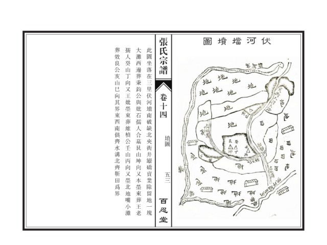 张氏宗谱 圖 墳 壋 河 伏 葬效良公亥山巳向其界東西南俱齊水溝北齊靳田爲界 孺人癸山丁向又王妣塋東葬維楨公壬山丙向又塋北地嘴小灘 大灘西邊葬秉鈞公與妣石孺人合墓艮山坤向又本塋東葬王老 此圖坐落在三里伏河壋南破缺北夾衖井罎礄賣業除留地一塊 卷十四 墳圖 五三 百忍堂