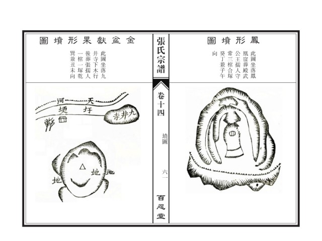 圖 墳 形 果 獻 盆 金 张氏宗谱 圖 墳 形 鳳 巽兼丑未向 一棺一塚乾 後葬張孺人 井寺下木行 此圖坐落九 向 癸丁兼子午 常三棺合塚 公王孺人守 凰窪葬殿武 此圖坐落鳳 卷十四 墳圖 六一 百忍堂