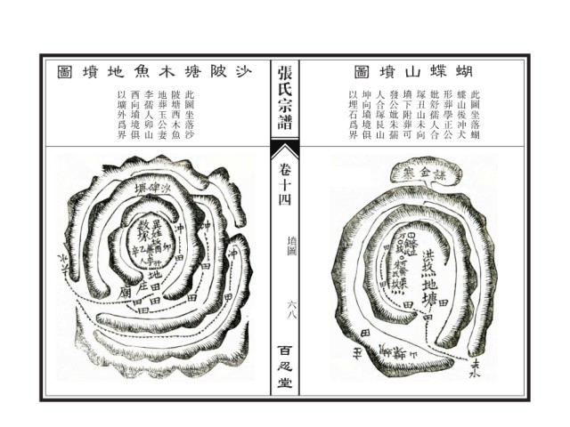 圖 墳 地 魚 木 塘 陂 沙 张氏宗谱 圖 墳 山 蝶 蝴 以壙外爲界 酉向墳境俱 李孺人卯山 地葬玉公妻 陂塘西木魚 此圖坐落沙 以埋石爲界 坤向墳境俱 人合塚艮山 發公妣朱孺 墳下附葬可 塚丑山未向 妣舒孺人合 形葬學正公 蝶山後冲犬 此圖坐落蝴 卷十四 墳圖 六八 百忍堂