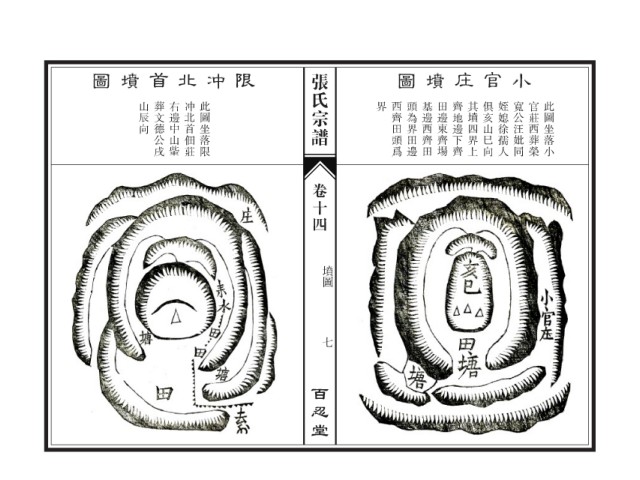 圖 墳 首 北 冲 限 张氏宗谱 圖 墳 庄 官 小 山辰向 葬文德公戌 右邊中山 冲北首佃莊 此圖坐落限 界 西齊田頭爲 頭為界田邊 基邊西齊田 田邊東齊場 齊地邊下齊 其墳四界上 俱亥山巳向 姪媳徐孺人 寬公汪妣同 官莊西葬榮 此圖坐落小 卷十四 墳圖 七 百忍堂