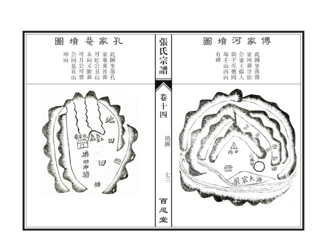 圖 墳 家 孔 张氏宗谱 圖 墳 河 家 傅 坤向 公同墓艮山 可月公可貴 未向又附葬 可旺公丑山 家菴東首葬 此圖坐落孔 有碑 塚壬山丙向 與子可德同 公妻王孺人 家河葬守怡 此圖坐落傳 卷十四 墳圖 七三 百忍堂