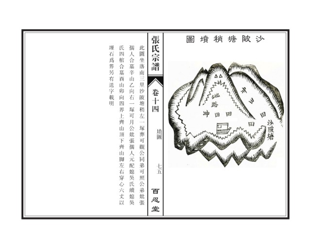 张氏宗谱 圖 墳 稍 塘 陂 沙 埋石爲界另有送字載明 氏四棺合墓酉山卯向四界上齊山頂下齊山脚左右穿心六丈以 孺人合墓辛山乙向右一塚可月公妣張孺人元配媳吳氏續媳吳 此圖坐落南三里沙陂塘稍左一塚葬可觀公同弟可照公弟妣張 卷十四 墳圖 七五 百忍堂