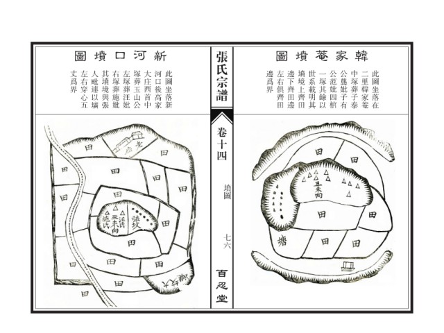 圖 墳 口 河 新 张氏宗谱 圖 墳 菴 家 韓 丈爲界 左右穿心五 人毗連以壙 其墳境與張 右塚葬施妣 左塚葬汪妣 塚葬玉山公 大庄西首中 河口後高家 此圖坐落新 邊爲界 左右俱齊田 邊下齊田邊 墳境上齊田 世系載明其 一塚其餘以 公范妣四棺 公龔妣子有 中塚葬子泰 二里韓家菴 此圖坐落在 卷十四 墳圖 七六 百忍堂