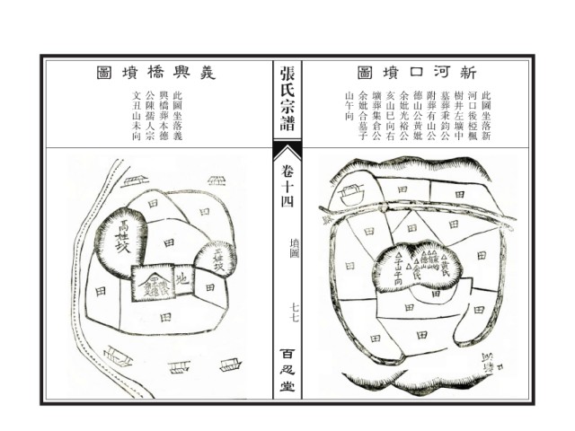 圖 墳 橋 興 義 张氏宗谱 圖 墳 口 河 新 文丑山未向 公陳孺人宗 興橋葬本德 此圖坐落義 山午向 余妣合墓子 壙葬集倉公 亥山巳向右 余妣光裕公 德山公黃妣 附葬有山公 墓葬秉鈞公 樹井左壙中 河口後椏楓 此圖坐落新 卷十四 墳圖 七七 百忍堂