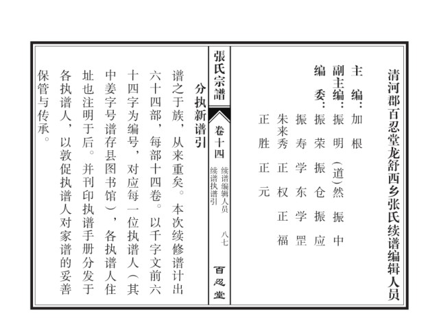张氏宗谱 保管与传承。 各执谱人,以敦促执谱人对家谱的妥善 址也注明于后。并刊印执谱手册分发于 中姜字号谱存县图书馆),各执谱人住 十四字为编号,对应每一位执谱人(其 六十四部,每部十四卷。以千字文前六 谱之于族,从来重矣。本次续修谱计出 编 副主编: 主 清河郡百忍堂龙舒西乡张氏续谱编辑人员 分执新谱引 委: 编: 正 朱来秀 振 振 振 加 卷十四 胜 寿 荣 明 根 振 学 正 正 ( 续谱执谱引 续谱编辑人员 道 仓 东 权 元 ) 然 振 学 正 振 八七 应 福 罡 中 百忍堂