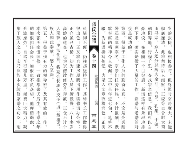 聚了族人之心,实乃我族本次续修家谱 奔波操劳,自驾车行程几万里,耗费巨大精力,凝 的加根担任会长。加根也不负众望,他殚精竭虑, 本次张氏宗谱续修,一致推举张氏后生、不惑之年 第五,得益于强有力的领导班子及其有效的工作。 族人如此奉献,感人至深。 人荣誉,主动让贤,将副会长职务交予(道)然担当, 高龄的道炎,也为宗谱续修劳苦奔波。正仓不计个 正仓虽已古稀,却为工作人员下厨做餐;八十多岁 很出色;正友将自建房屋腾出用作续修谱办公室; 虽腿脚不便,仍拄拐坚持工作,其秘书长工作做得 辍,为新谱撰写传记,为录入文章改稿润色;正明 默奉献的精神令人敬佩。正中虽年近七旬,笔耕不 暑还是凛冽寒冬,宗亲们任劳任怨,不计报酬,默 第四,得益于工作人员的勤奋认真。不论是炎炎酷 接是成功的。 列下来,确实是做了大量的工作,新谱与老谱的对 豪地说,在相隔一个世纪后,新谱这样有条理地排 朝阳等地,行程千里,查找宗亲信息。我们可以自 山寻宗。众人还分赴阙店余冲、五显、孔集、干镇、 彻底厘清,此将留待后人细察;正应等去合肥大蜀 岁的张捷,也积极参与。但终因时空跨度大,未能