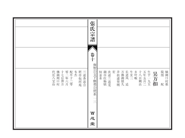 张氏宗谱 卷十 傑智公支下修勇公世系 代庄八宝山 佛湖闸口村 十七日葬万 零二年六月 配卒于二零 韦杰 肥市包河苑 三道香适合 何金水 湖市红杨镇 次道兰适芜 宏 井街道贺明 万佛湖镇九 长道凤 生女三 乡叶畈 十八日阙店 五年五月二 生于一九五 吴方扣 院组 镇闸口村张 适 配 一三 百忍堂