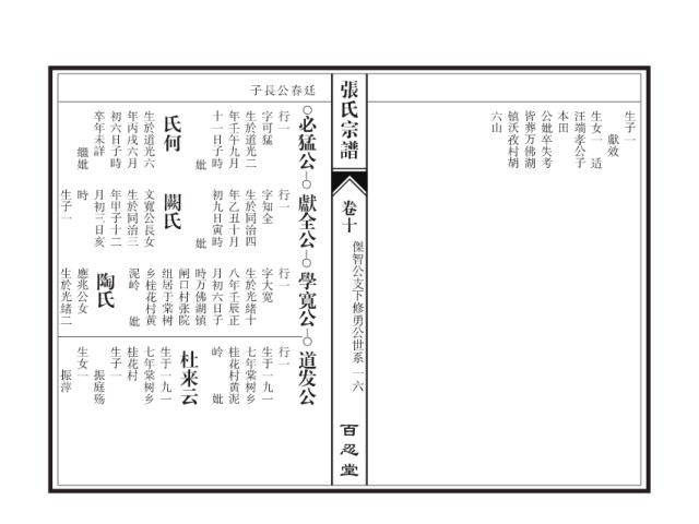 卒年未詳 初六日子時 年丙戌六月 生於道光六 氏何 十一日子時 年壬午九月 生於道光二 字可猛 行一 必猛公 六山 镇沃孜村胡 皆葬万佛湖 公妣卒失考 本田 汪端孝公子 生女一 生子一