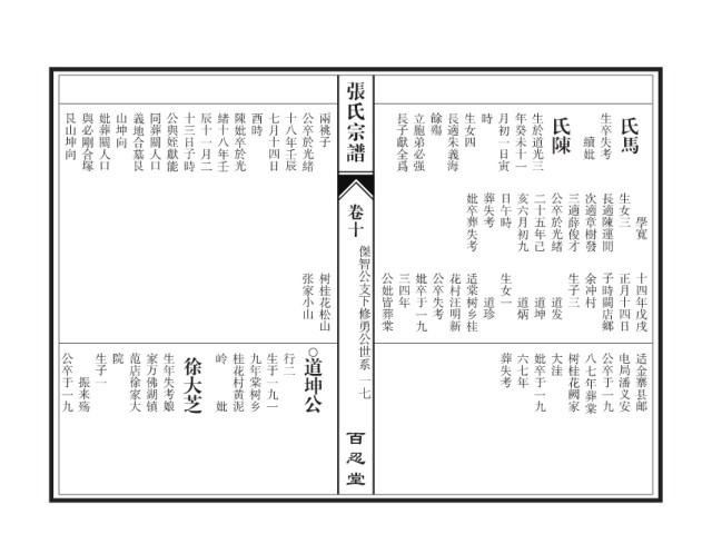 公卒于一九 生子一 院 范店徐家大 家万佛湖镇 生年失考娘 徐大芝 岭 桂花村黄泥 九年棠树乡 生于一九一 行二 道坤公 葬失考 六七年 妣卒于一九 大洼 树桂花阙家 八七年葬棠 公卒于一九 电局潘义安 适金寨县邮