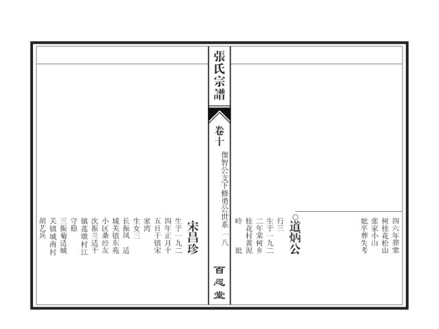 张氏宗谱 卷十 傑智公支下修勇公世系 胡艺兵 关镇城南村 三振菊适城 守稳 镇莲墩村江 次振兰适干 小区桑经友 城关镇东苑 长振凤 生女三 家湾 五日干镇宋 四年正月十 生于一九二 宋昌珍 岭 桂花村黄泥 二年棠树乡 生于一九二 行三 道炳公 妣卒葬失考 张家小山 树桂花松山 四六年葬棠 一八 适 妣 百忍堂