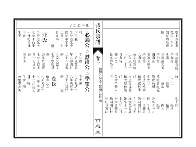 葬失考 時 月十七日亥 七年丁巳七 公卒於咸豐 嗣 七子學榮爲 立堂兄獻文 時 二十八日未 年乙卯四月 生於咸豐五 字知禮 獻禮公 妣卒葬失考 葬失考 日寅時 一月二十三 二年庚戌十 公卒於宣統 六適汪 子絢德 五適文範玉 四適汪 子相富 三適潘文玉 次殤 子和芳 長適陳官勝
