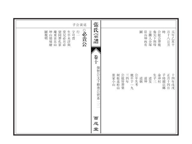张氏宗谱 子公寅廷 圖載明 坤山墳境繪 庵東首艮山 望同葬孔家 堂兄必月必 生卒未詳與 字可貴 行一 必貴公 圖 艮山坤向有 方孺人合塚 角尖下與母 公妣合葬鹿 時 月十八日丑 元年乙亥十 卷十 傑智公支下修勇公世系 张家小山 树桂花松山 公妣皆葬棠 三四年 妣卒于一九 公卒失考 生子三 余冲村 子時闕店鄉 正月十四日 十四年戊戌 道炳 道坤 道发 二二 百忍堂