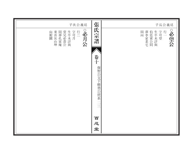 张氏宗谱 子次公義廷 子長公義廷 向附圖 東首艮山坤 同葬孔家庵 堂兄必貴公 生卒未詳與 字可月 行二 必月公 同向 葬李家老宅 伯廷寅公同 生卒未詳與 字可望 行一 必望公 卷十 傑智公支下修勇公世系 二三 百忍堂