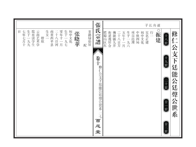张氏宗谱 子长舟道 日 七年七月十 生于一九九 院在读学生 云南艺术学 生女一 南省西平县 二十八日河 零年十一月 生于一九七 初中文化 张晓苹 至路绿怡居 肥蜀山区东 街道现居合 佛湖镇九井 二十八日万 五年十一月 生于一九六 项目经理 中铁四局 初中文化 实名正建 行一 振建 修仁公支下廷能公廷聲公世系 十八世 舒欣 配 卷十 十九世 修仁公支下廷能公廷聲公世系 二十世 廿一世 二七 百忍堂 廿二世