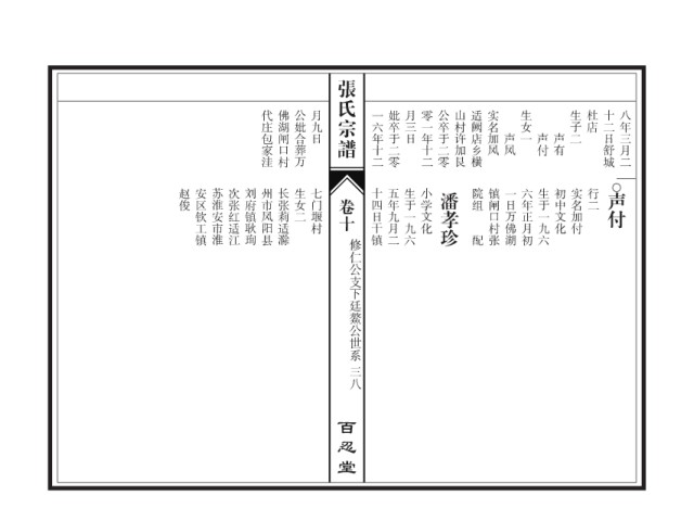 张氏宗谱 代庄包家洼 佛湖闸口村 公妣合葬万 月九日 一六年十二 妣卒于二零 月三日 零一年十二 公卒于二零 山村许加艮 适阙店乡横 实名加凤 生女一 生子二 杜店 十二日舒城 八年三月二 声付 声凤 声有 赵俊 安区钦工镇 苏淮安市淮 次张红适江 刘府镇耿珣 州市凤阳县 长张莉适滁 生女二 七门堰村 十四日干镇 五年九月二 生于一九六 小学文化 潘孝珍 院组 镇闸口村张 一日万佛湖 六年正月初 生于一九六 初中文化 实名加付 行二 声付 卷十 配 修仁公支下廷鰲公世系 三八 百忍堂