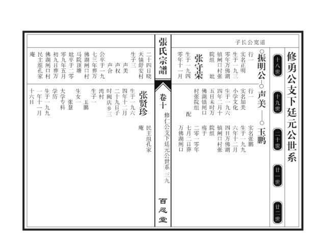 庵 民主组孔家 佛湖闸口村 初九日葬万 零九年五月 妣卒于二零 马院顶塘 佛湖闸口村 七三年葬万 公卒于一九 生子三 天镇舒安村 二十四日晓 零年十一月 生于一九四 张守荣 院组 镇闸口村张 零年万佛湖 生于一九三 实名正明 行一 振明公 修勇公支下廷元公世系