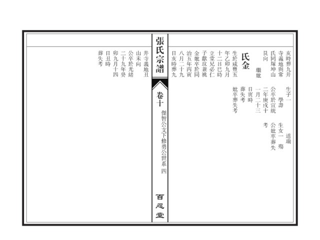 张氏宗谱 葬失考 日丑時 卯九月十四 二十九年癸 公卒於光緒 山未向 井寺義地丑 日亥時葬九 八月二十九 治五年丙寅 金妣卒於同 子獻玟兼祧 立堂兄必仁 十二日巳時 年乙卯九月 生於咸豐五 氏金 艮向 氏同塚坤 寺義地與常 亥時葬九井 繼妣 山 妣卒葬失考 葬失考 日寅時 一月二十三 二年庚戌十 公卒於宣統 生子一 卷十 學壽 傑智公支下修勇公世系 考 公妣卒葬失 生女一 道瑞 殤 四 百忍堂