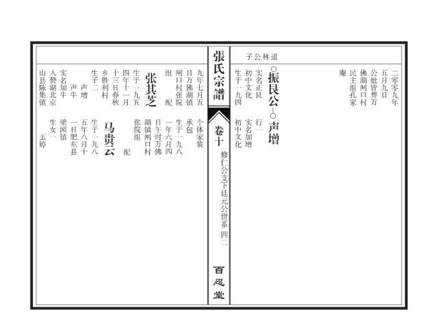 张氏宗谱 子公林道 山县陈集镇 入赘湖北京 实名加牛 生子二 乡胜利村 十三日春秋 四年十一月 生于一九五 张其芝 组 闸口村张院 日万佛湖镇 九年七月五 生于一九四 初中文化 实名正艮 振艮公 庵 民主组孔家 佛湖闸口村 公妣皆葬万 五月九日 二零零九年 声牛 声增 配 生女一 梁园镇 一日肥东县 五年八月十 生于一九八 马贵云 张院组 湖镇闸口村 日午时万佛 一年六月四 生于一九八 承包 个体家装 初中文化 实名加增 行一 声增 卷十 玉婷 配 修仁公支下廷元公世系 四二 百忍堂