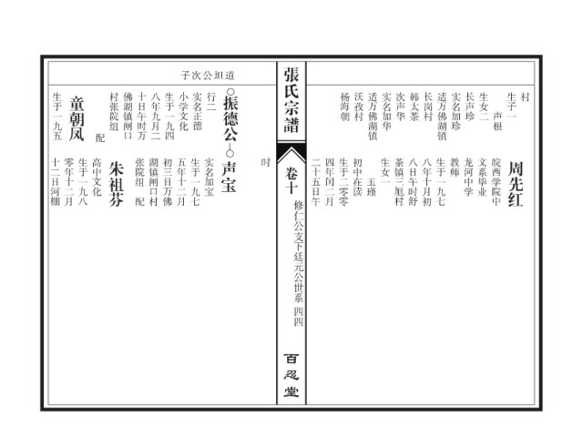 生于一九五 童朝凤 村张院组 佛湖镇闸口 十日午时万 八年九月二 生于一九四 小学文化 实名正德 行二 振德公 杨海朝 沃孜村 适万佛湖镇 实名加华 次声华 韩太茶 长岗村 适万佛湖镇 实名加珍 长声珍 生女二 生子一 村