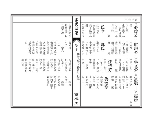 山 沃孜村胡六 皆葬万佛湖 公妣卒失考 集镇滕富贵 次学换适孔 街道周世贵 佛湖镇九井 长学凤适万 生女二 生子一 管岭村 子時阙店乡 一月初六日 十年甲午十 生於光緒二 繼遠公女 郭氏 组 闸口村张院 時万佛湖镇 月十三日亥 八年壬辰七 生於光緒十 字知明 獻珉公