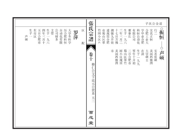 张氏宗谱 子次公全道 生子一 东市区 五日合肥市 四年三月十 生于一九六 主管 公司财务 自动化有限 历合肥科恒 大学本科学 罗萍 区 竹园小区 市蜀山区翠 道现居合肥 湖镇九井街 十七日万佛 三年三月二 生于一九六 董事长 有限公司 科恒自动化 学毕业合肥 合肥工业大 实名正恒 行二 振恒 声硕 配 C 市 美国西雅图 园小区现居 蜀山区翠竹 二日合肥市 零年十月初 生于一九九 在读 大学硕士 美国西雅图 实名张硕 声硕 卷十 修仁公支下廷元公世系 五三 百忍堂