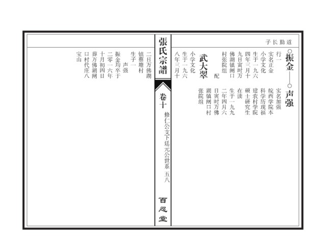 张氏宗谱 子长勤道 宝山 口村代庄八 葬万佛湖闸 十月初四日 二零一六年 振金均卒于 生子一 镇蔡塘村 二日万佛湖 八年三月十 生于一九六 小学文化 武大翠 村张院组 佛湖镇闸口 九日寅时万 四年三月十 生于一九六 小学文化 实名正金 行一 振金 声强 配 张院组 湖镇闸口村 日寅时万佛 二年四月六 生于一九九 在读 硕士研究生 建农村学院 科学历现福 皖西学院本 实名加强 声强 卷十 修仁公支下廷元公世系 五八 百忍堂