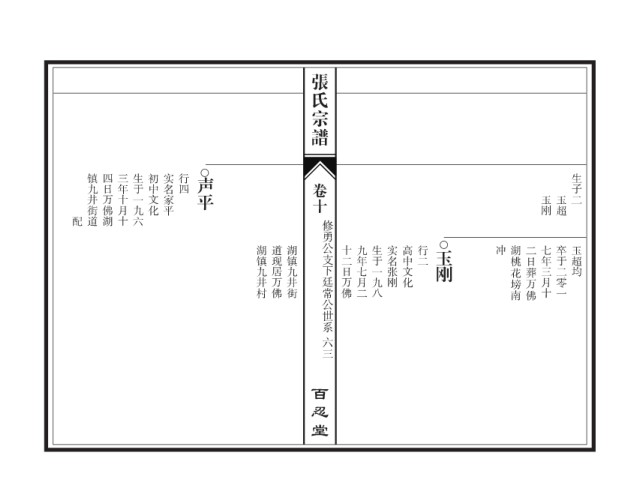 张氏宗谱 镇九井街道 四日万佛湖 三年十月十 生于一九六 初中文化 实名家平 行四 声平 生子二 卷十 玉刚 玉超 配 修勇公支下廷常公世系 湖镇九井村 道现居万佛 湖镇九井街 十二日万佛 九年七月二 生于一九八 实名张刚 高中文化 行二 玉刚 冲 湖桃花塝南 二日葬万佛 七年三月十 卒于二零一 玉超均 六三 百忍堂