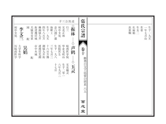 张氏宗谱 子三公凯道 初中文化 李文兰 园 关镇青青家 街道现居城 佛湖镇九井 四年八月万 生于一九五 休职工 县白酒厂退 初中文化 实名正林 行三 振林 次张娴 长丽娟 生女二 东省 一年七月山 生于一九五 配 历皖南医学 大学本科学 吴娟 市中央城 道现居芜湖 湖镇九井街 十六日万佛 三年七月二 生于一九八 医院医生 毕业戈矶山 皖南医学院 声鹤 卷十 配 修勇公支下廷常公世系 十七日 六年九月二 生于二零一 实名翰灵 玉灵 六五 百忍堂