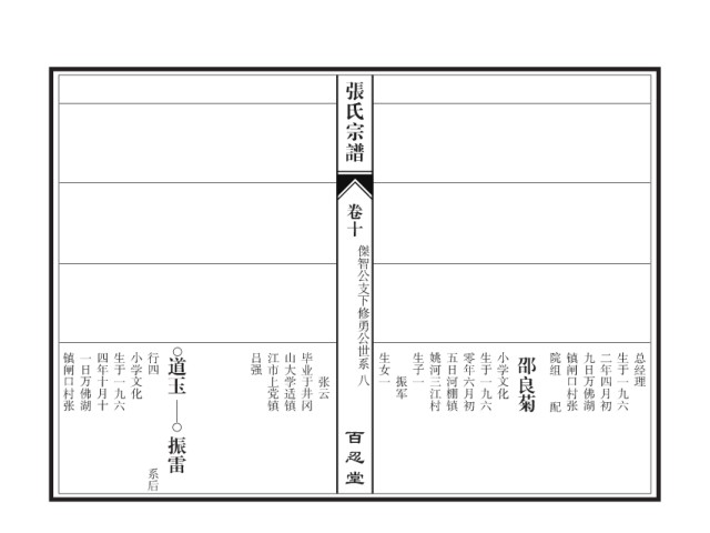 张氏宗谱 卷十 傑智公支下修勇公世系 镇闸口村张 一日万佛湖 四年十月十 生于一九六 小学文化 行四 道玉 吕强 江市上党镇 山大学适镇 毕业于井冈 生女一 生子一 姚河三江村 五日河棚镇 零年六月初 生于一九六 小学文化 邵良菊 院组 镇闸口村张 九日万佛湖 二年四月初 生于一九六 总经理 振军 张云 八 配 百忍堂 振雷 系后