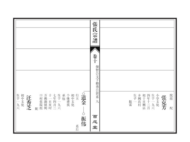 张氏宗谱 卷十 傑智公支下修勇公世系 生于一九六 初中文化 汪秀芝 口村张院组 万佛湖镇闸 十一日亥时 七年四月二 生于一九六 承包 个体建筑 初中文化 行五 道金 生子一 乡阙店村 初十日阙店 四年十二月 生于一九六 小学文化 张克芳 院组 九 振雷 配 配 百忍堂 振伟 系后