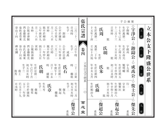 日戌時 巳五月十九 五十二年癸 公卒於康熙 生子二 生失考 氏章 生子二 初五日亥時 年壬辰二月 生於順治九 氏蘇 初十日亥時 年辛卯十月 生於順治八 號聚垣 字星奎 行一 俊士公