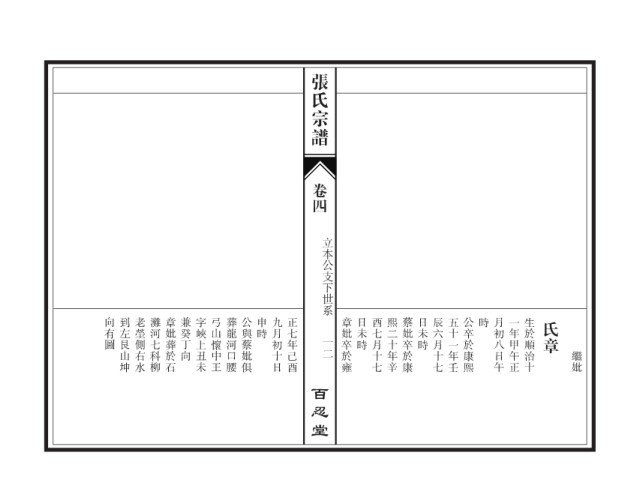 张氏宗谱 卷四 立本公支下世系 向有圖 到左艮山坤 老塋側右水 灘河七科柳 章妣葬於石 兼癸丁向 字峽上丑未 弓山懷中王 葬龍河口腰 公與蔡妣俱 申時 九月初十日 正七年己酉 章妣卒於雍 日未時 酉七月十七 熙二十年辛 蔡妣卒於康 日未時 辰六月十七 五十一年壬 公卒於康熙 時 月初八日午 一年甲午正 生於順治十 氏章 一二 繼妣 百忍堂
