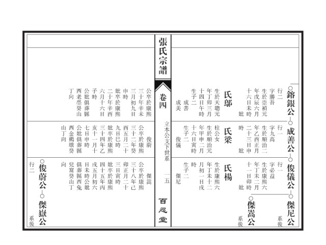 行二 俊蔚公 向 兒窩癸山丁 俱葬縣西兔 日未時公妣 戌五月初六 四十五年丙 妣卒於康熙 三日寅時 卯正月二十 三十八年己 公卒於康熙 生子二 時 月初一日戌 年丁未十二 生於康熙六 氏楊 十一日卯時 年丁未二月 生於康熙六 字必益 行一 俊儀公