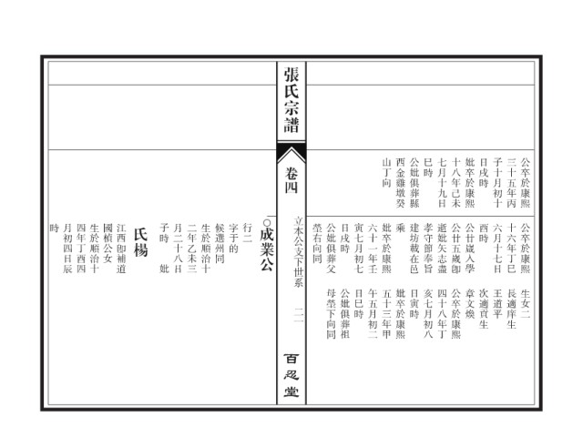 時 月初四日辰 四年丁酉四 生於順治十 國楨公女 江西卽補道 氏楊 子時 月二十八日 二年乙未三 生於順治十 候選州同 字于的 行二 成業公 塋右向同 公妣俱葬父 日戌時 寅七月初七 六十一年壬 妣卒於康熙 乘 建坊載在邑 孝守節奉旨 逝妣矢志盡 公廿五嵗卽 公廿嵅入學 酉時 六月十七日 十六年丁巳 公卒於康熙