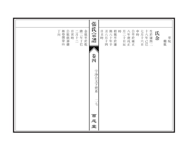 张氏宗谱 丁向 林 公妣俱葬德 日寅時 二月十二 隆二年丁巳 余妣卒於乾 日丑時 丑六月十四 熙六十年辛 程妣卒於康 時 月二十日辰 八年庚戌正 公卒於雍正 申時 七月十六日 十八年己巳 生於康熙二 氏余 側癸山 華皖 繼妣 卷四 宇净公支下世系 二七 百忍堂