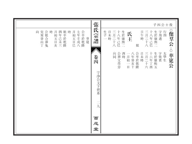 张氏宗谱 子四公士俊 向 兒窩癸山丁 公妣合葬兔 時 月初五日亥 四年己未三 妣卒於乾隆 時 月初五日巳 七年壬戌八 公卒於乾隆 生子一 日未時 三月二十八 十八年己巳 生於康熙二 氏王 日午時 三月二十八 十八年己巳 生於康熙二 字邦遴 行四 傑羣公 華筵 妣 向同 公葬父塋旁 酉時 一月初一日 八年癸亥十 公卒於乾隆 日未時 三月二十六 十六年丁酉 生於康熙五 字效賓 太學生 華筵公 卷四 宇净公支下世系 二九 百忍堂
